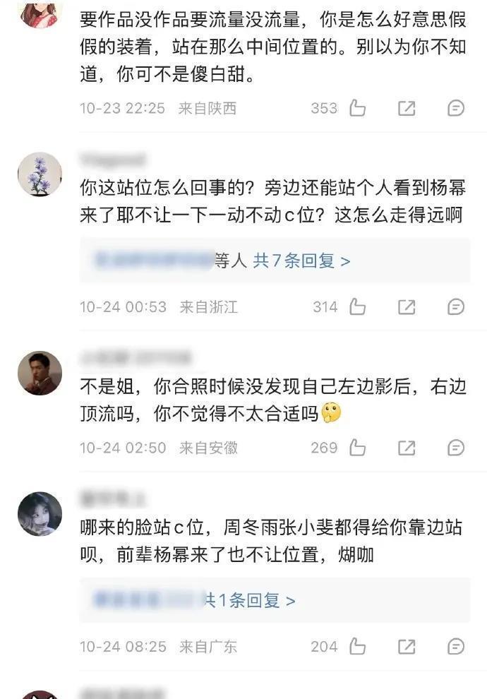 就这样,杨幂和刘亦菲站到双C的位置。本就很狭窄的中间,两人还硬是不肯碰到对方,刘亦菲侧过一旁跟马思纯热聊,杨幂则尴尬地黑着脸。明明钟楚曦旁边还有空位,但是她就是不肯挪动,导致刘冲不得不侧身挤进人群,还不慎踩到了刘亦菲的裙摆。